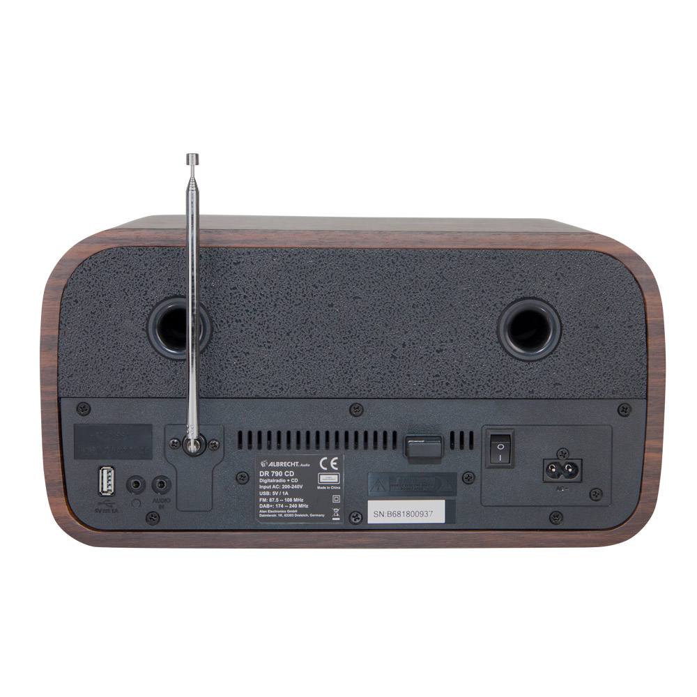 Erstmals bringt Albrecht mit dem DR 790 CD eine Kombination aus Digitalradio und CD-Player ins heimische Wohnzimmer. Zusätzlich bietet das Gerät im edlen braunen Holzgehäuse weitere Betriebsmodi wie UKW-Radio, USB-Anschluss (für MP3-Player), AUX-IN und Bluetooth (z. B. zum Abspielen von Musik über Spotify). 20 Senderspeicher ermöglichen das komfortable und schnelle Suchen und Auswählen der persönlichen Lieblingsradiostationen. Das wertige Holzgehäuse sorgt mit zwei starken 15 Watt Lautsprechern für eine exzellente Klangqualität.