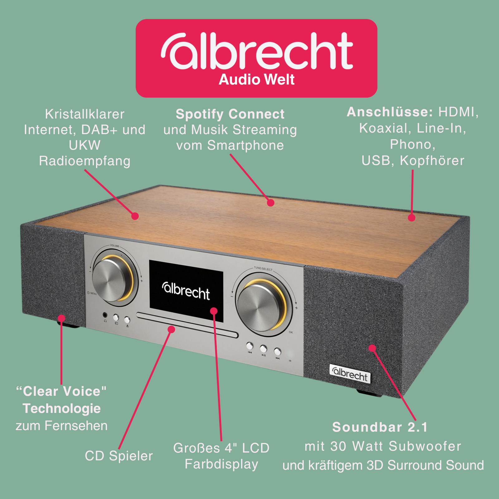 Das Albrecht DR 1000 ist ein vielseitiges und leistungsstarkes Soundsystem, das alle Ihre Audiobedürfnisse in einem Gerät vereint. Mit einer 2.1 Soundbar, einem 30 Watt Subwoofer und 3D Surround Sound sorgt es für ein beeindruckendes Klangerlebnis. Dank HDMI-Anschluss lässt sich das DR 1000 nahtlos an Ihren Fernseher anschließen, während das große 4" LCD-Farbdisplay Senderlogos und Album-Cover in Fullscreen anzeigt. Mit 8 Empfangsmodi (Internet-Radio, DAB+, UKW, CD, Streaming, USB, Spotify Connect, Podcast) und der Clear Voice Technologie für optimierte Dialoge ist das DR 1000 der perfekte Begleiter für Ihr Zuhause.