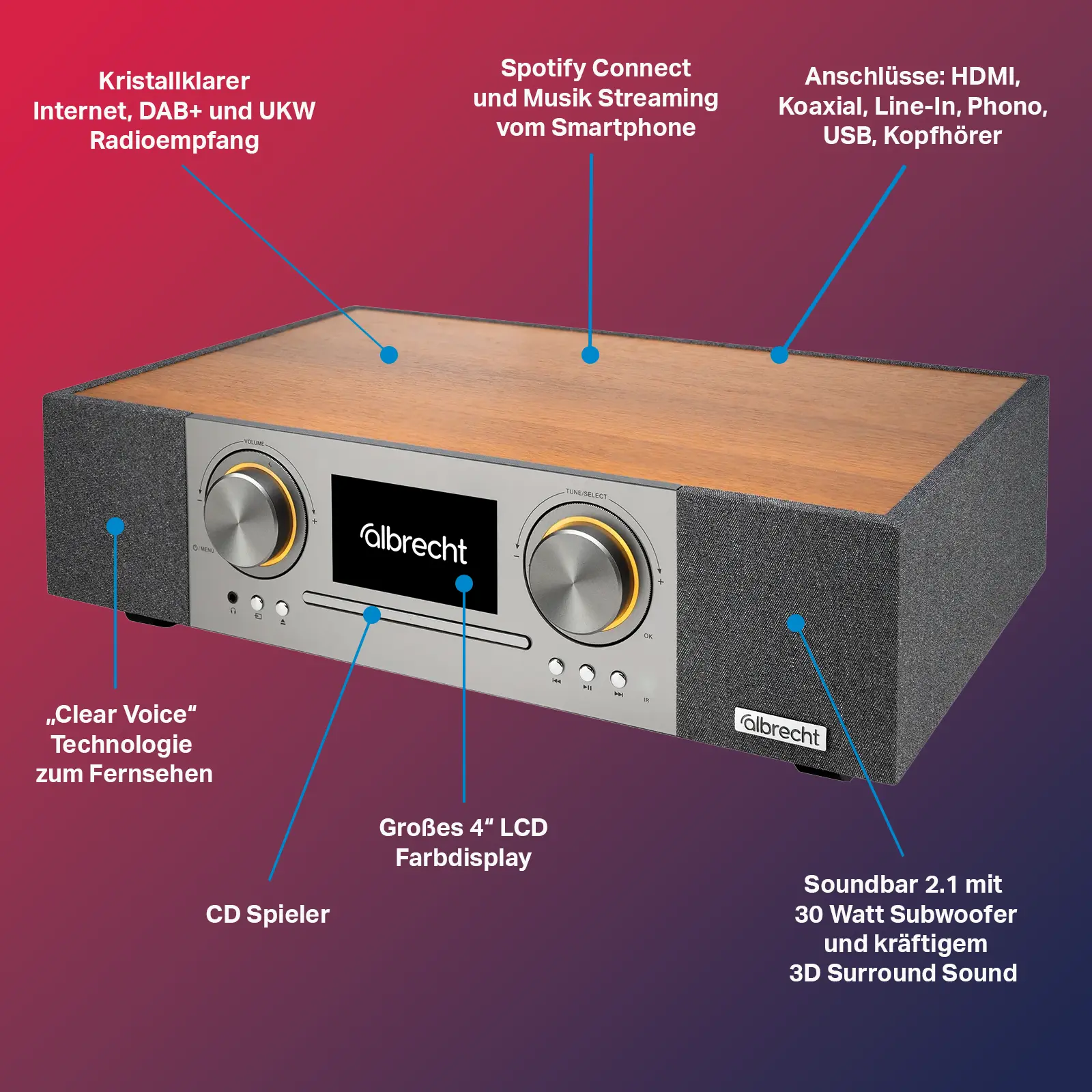 Das Albrecht DR 1000 ist ein vielseitiges und leistungsstarkes Soundsystem, das alle Ihre Audiobedürfnisse in einem Gerät vereint. Mit einer 2.1 Soundbar, einem 30 Watt Subwoofer und 3D Surround Sound sorgt es für ein beeindruckendes Klangerlebnis. Dank HDMI-Anschluss lässt sich das DR 1000 nahtlos an Ihren Fernseher anschließen, während das große 4" LCD-Farbdisplay Senderlogos und Album-Cover in Fullscreen anzeigt. Mit 8 Empfangsmodi (Internet-Radio, DAB+, UKW, CD, Streaming, USB, Spotify Connect, Podcast) und der Clear Voice Technologie für optimierte Dialoge ist das DR 1000 der perfekte Begleiter für Ihr Zuhause.