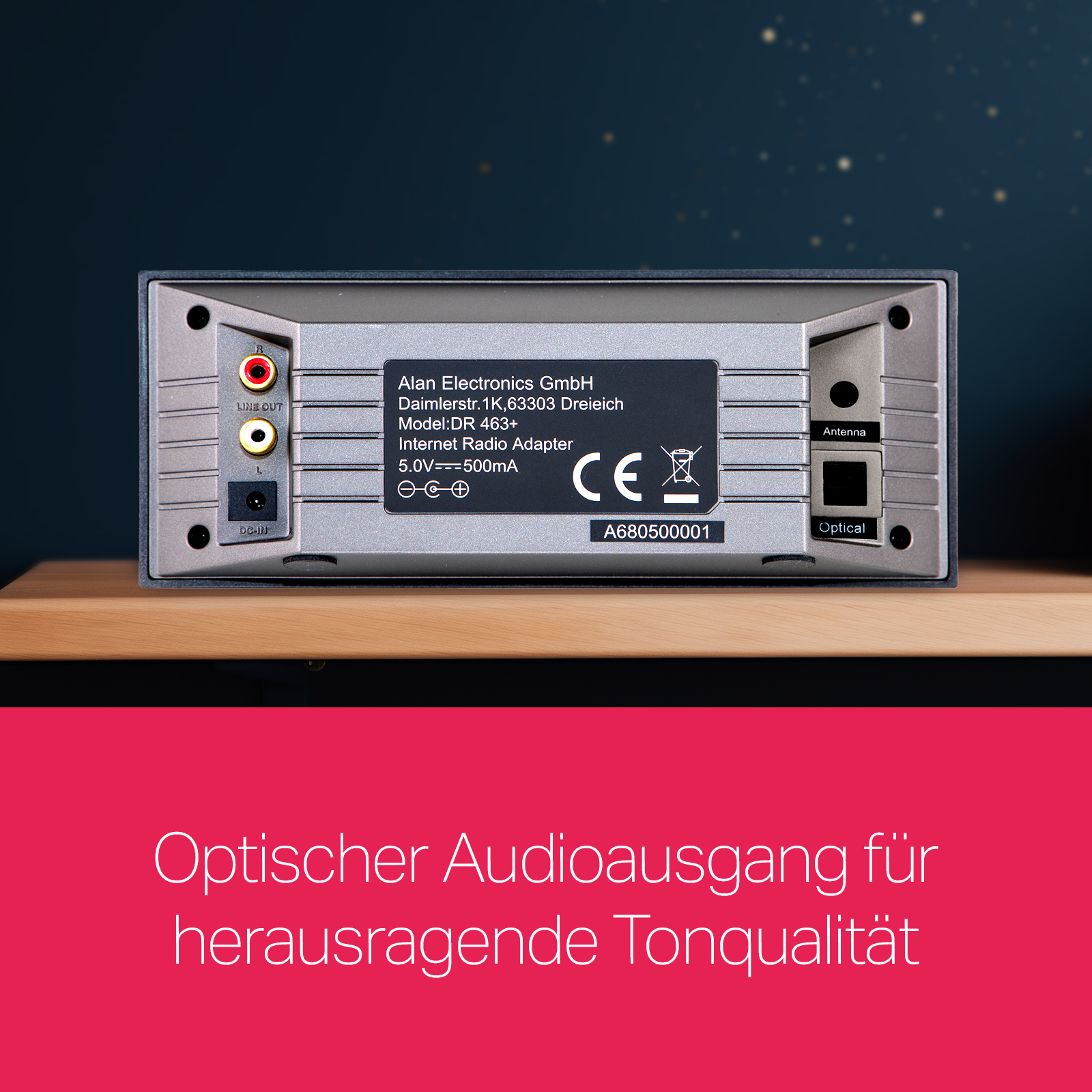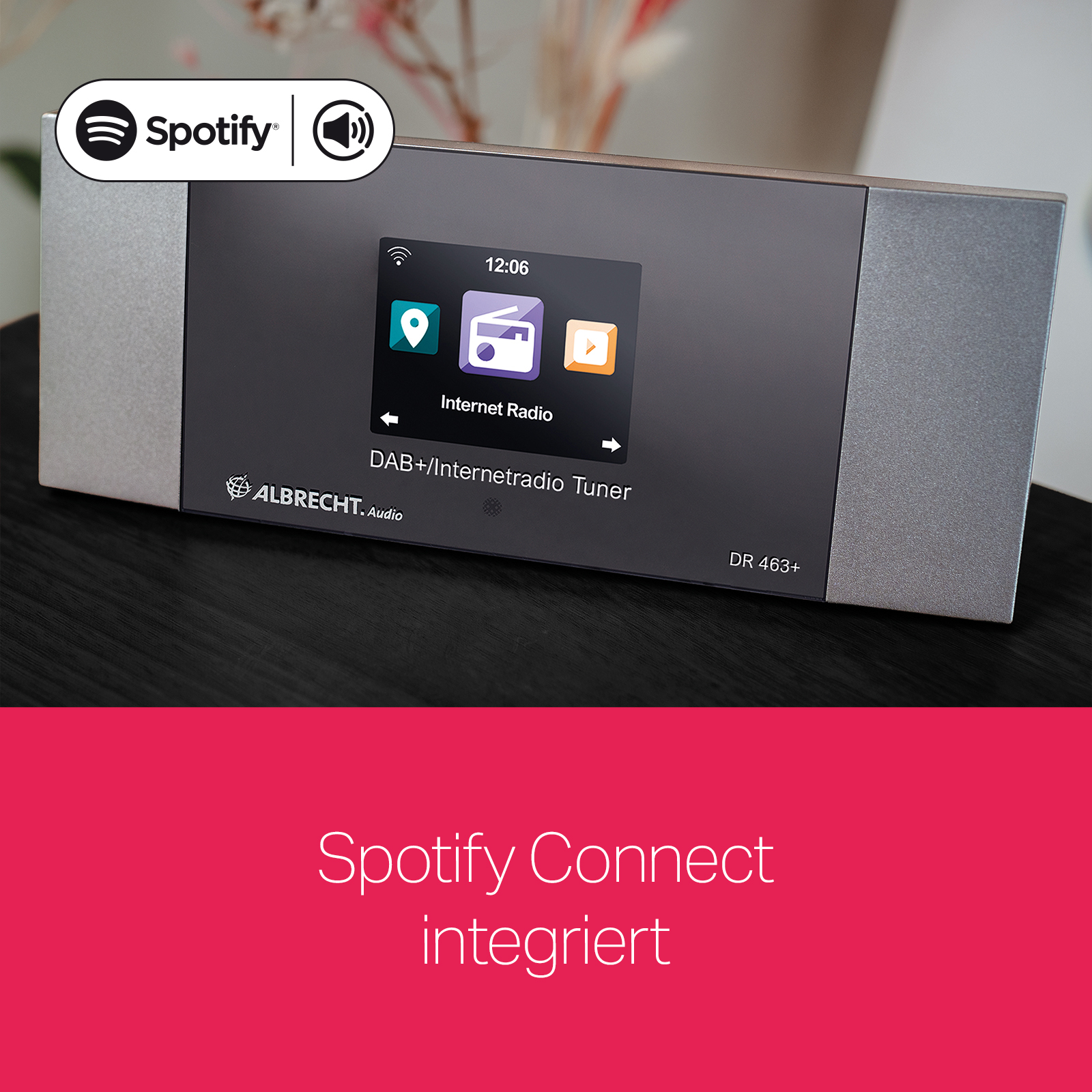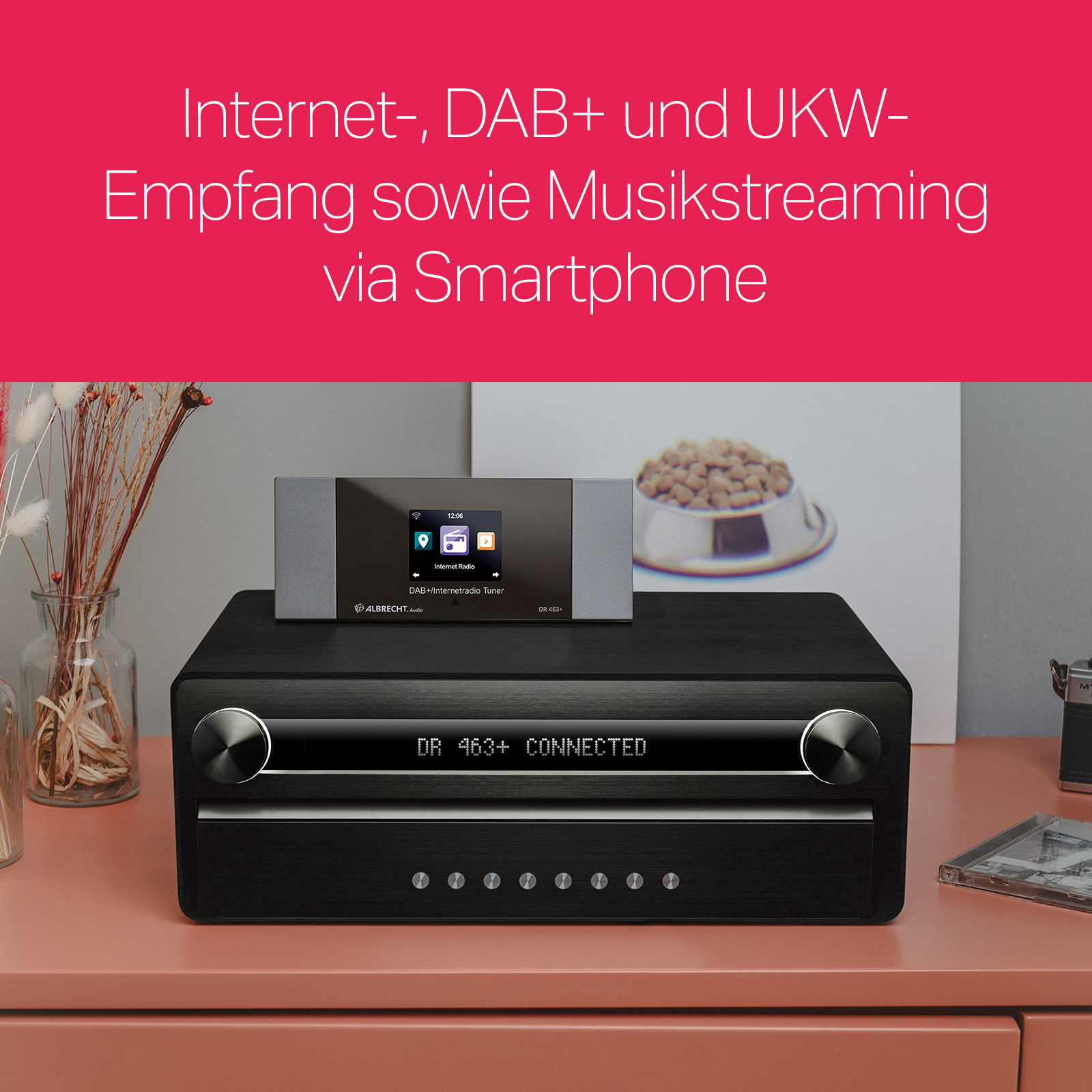 The Albrecht DR 463+ is a hybrid tuner with Internet, DAB+, FM radio and music streaming function for connection to your hi-fi system or loudspeaker system