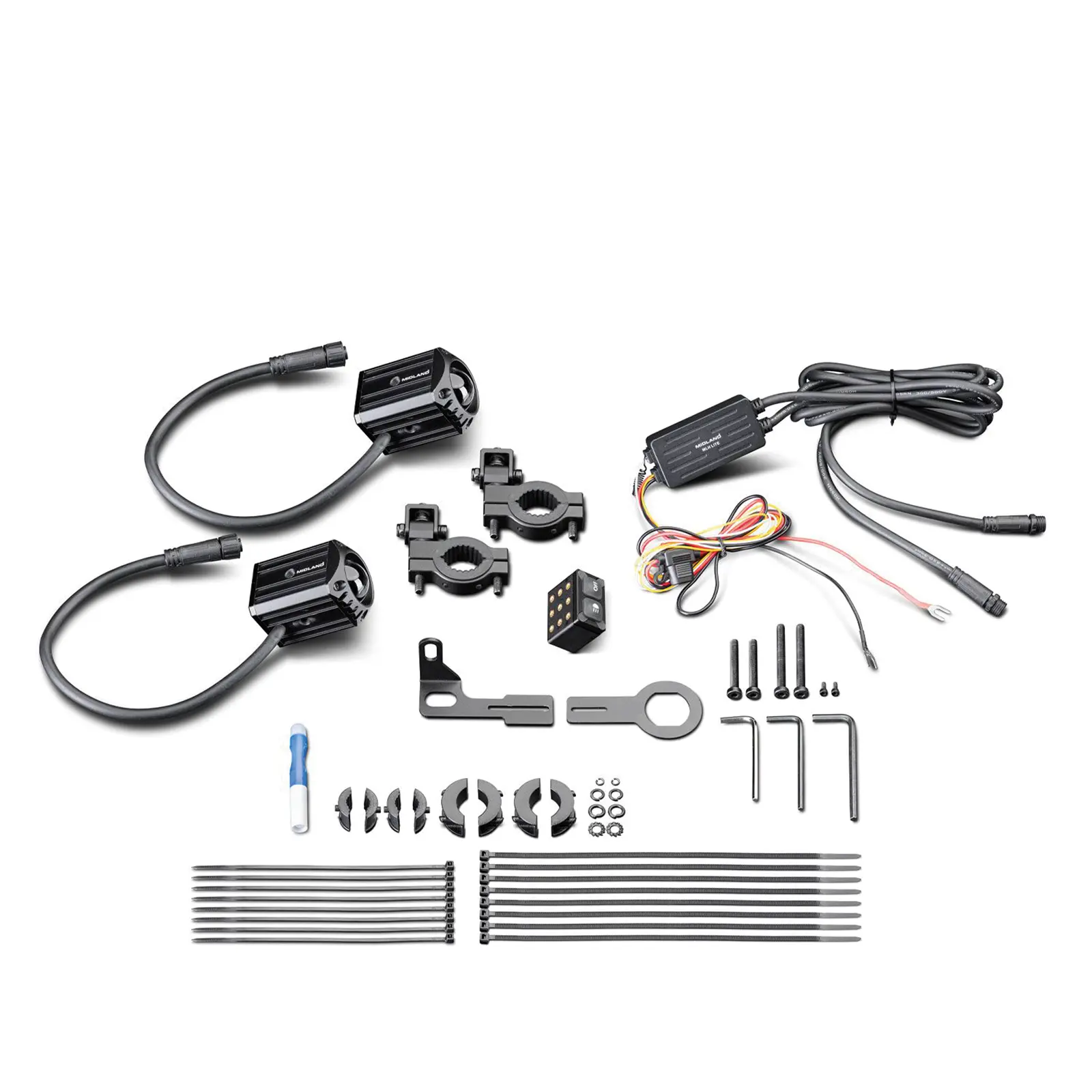 Lieferumfang: 2 LED-Strahlerlampen, Kabellose Fernbedienung inkl. CR2032 Batterie, Smarte Steuereinheit mit Kabeln, 2 Lenkerhalterungen, 2 Lenkeradapter, 1 Inbusschlüssel, Kabelklemmen.