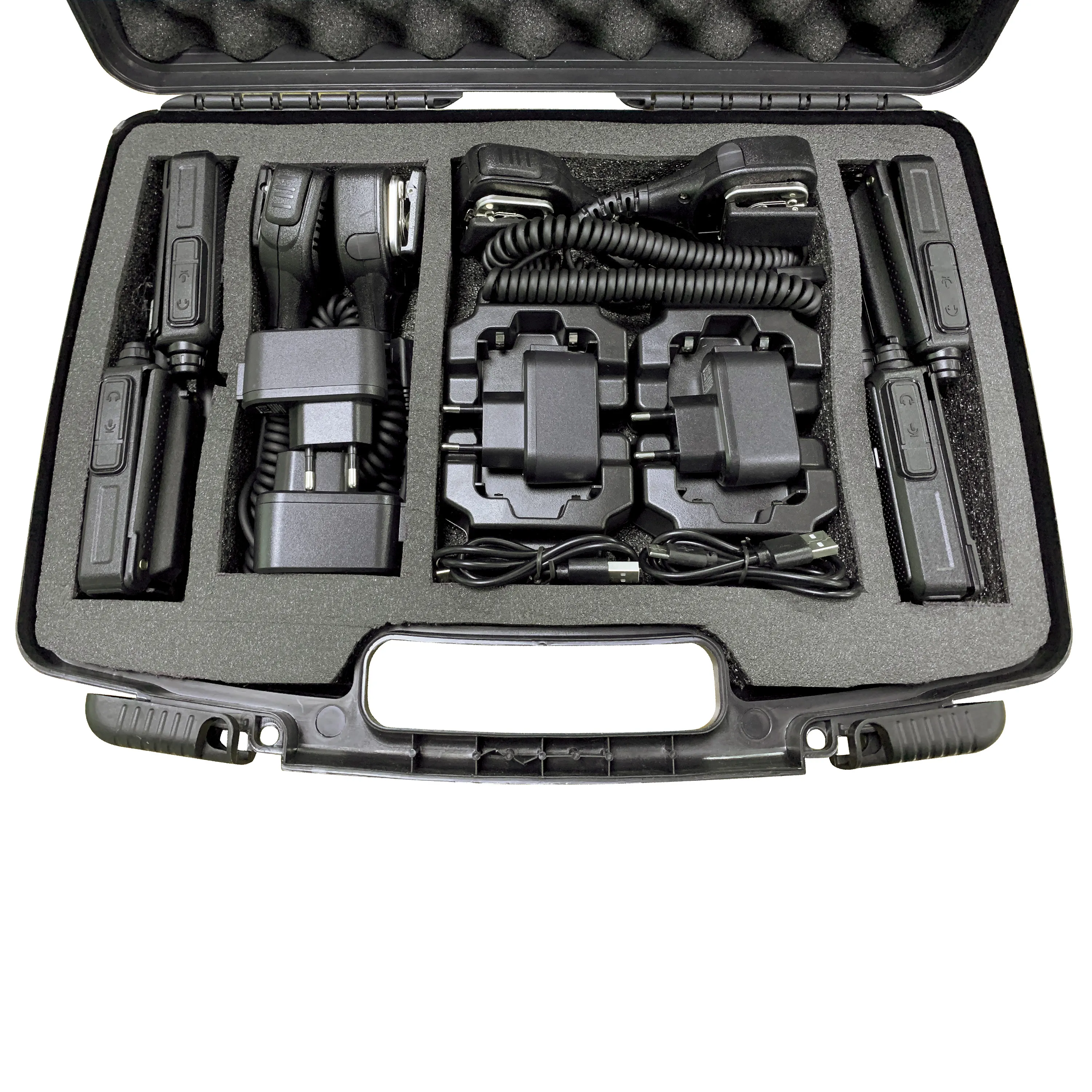 Das spritzwassergeschützte Gehäuse ist optimal für den Einsatz im Freien geeignet. Die Geräte werden in einem robusten Hartschalenkoffer ausgeliefert, in dem die Funkgeräte gut geschützt transportiert und aufbewahrt werden können.