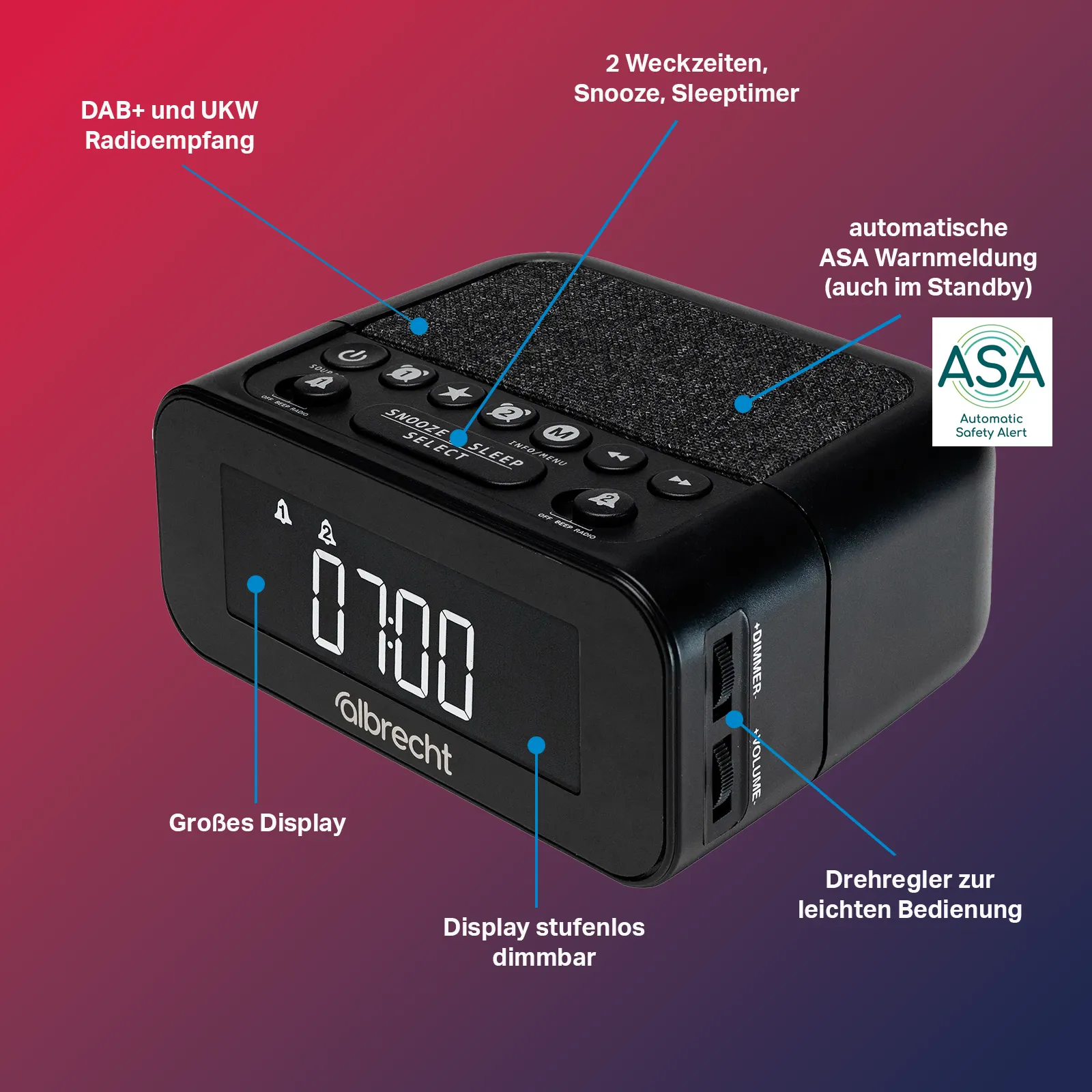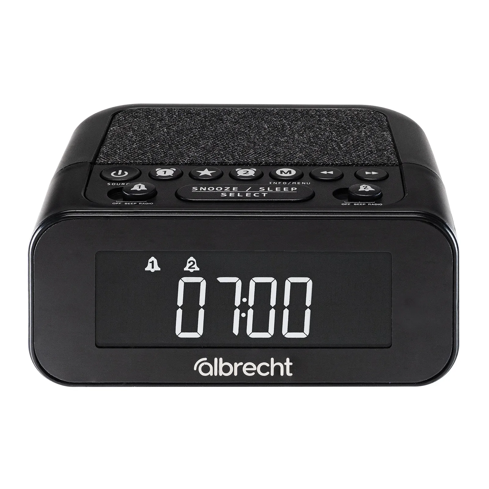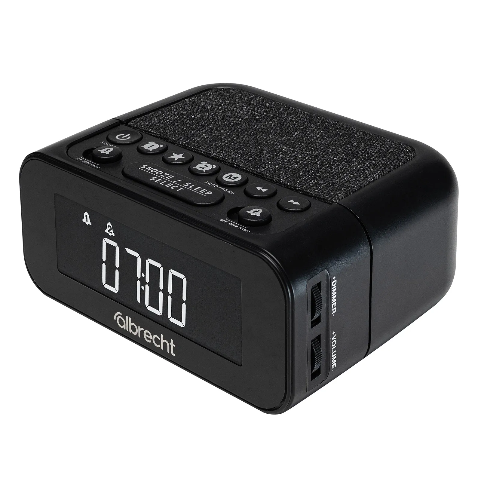 The Albrecht DR 451 radio alarm clock is the ideal companion for a perfect start to the day. Whether you want to wake up to the news, a morning show, or your favorite music, the DR 451 offers you a huge selection of music and programs. With noise-free DAB+ or traditional FM radio reception, you have a wide range of options at your disposal. The dimmable display ensures undisturbed sleep, while the crescendo function and slightly raised snooze button make it easier to get up. The DR 451 is not only a radio alarm clock, but also a reliable companion for a perfect start to the day.